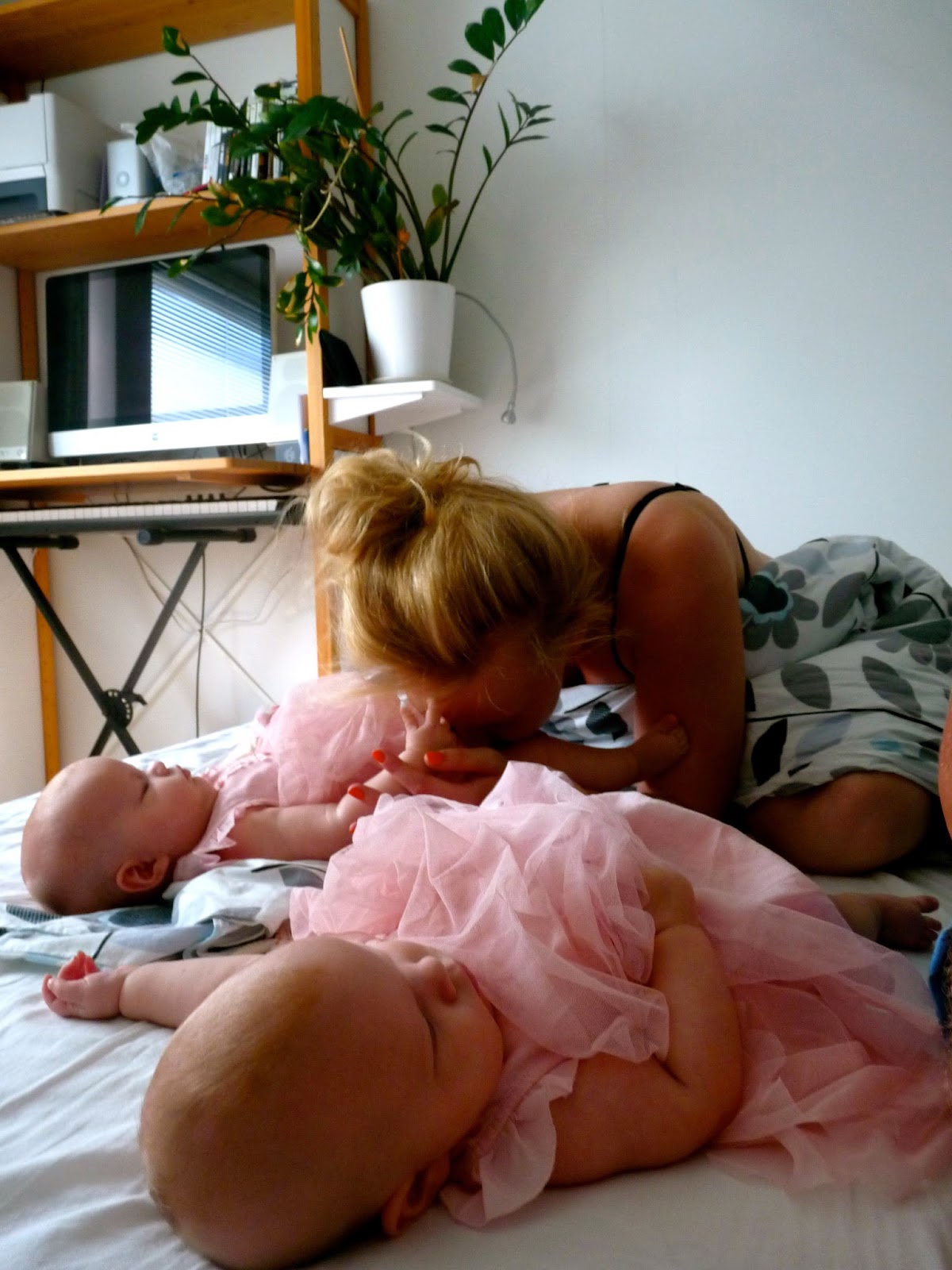 Meidän tytöt ovat nukkuneet jo kohta kuukauden omassa huoneessa keskenään. Yhteinen yksi pinnasänky alkoi käydä ahtaaksi kahdelle vauvalle, joten aloimme nukuttaa heitä omissa sängyissään ja samalla siirsimme sängyt lastenhuoneeseen. Lastenhuone on talomme varjoisalla puolella, joten siellä on ollut helteillä viileämpää ja tytöt ovatkin nukkuneet todella hyvin.